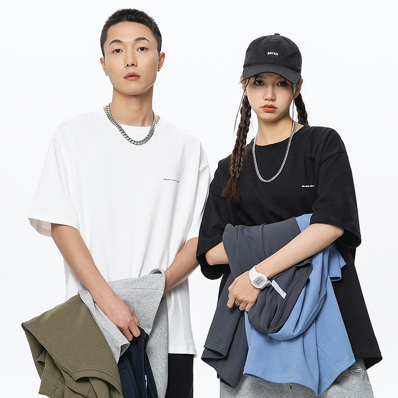 Baju pasangan katun berat gaya Jepang, Baju kaus lengan pendek leher bulat longgar gaya Korea desain niche merek trendi 2024
