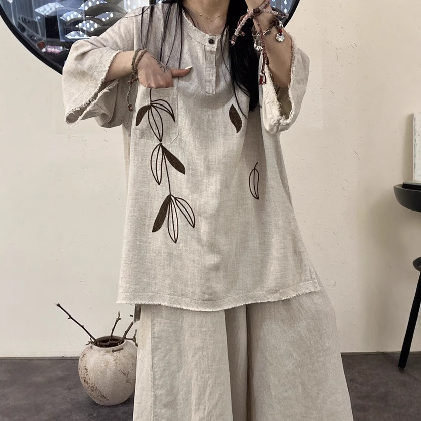 Kemeja Wanita Bordir Linen Model Musim Panas Retro Artistik Longgar Terlihat Kurus Versi Besar Kasual Mudah Dipadu Padan Kaos Pullover 816
