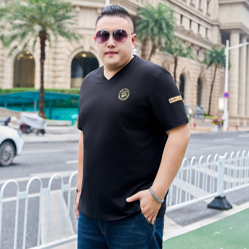 Kaus lengan pendek pria, kaus ukuran besar leher V hitam longgar musim panas