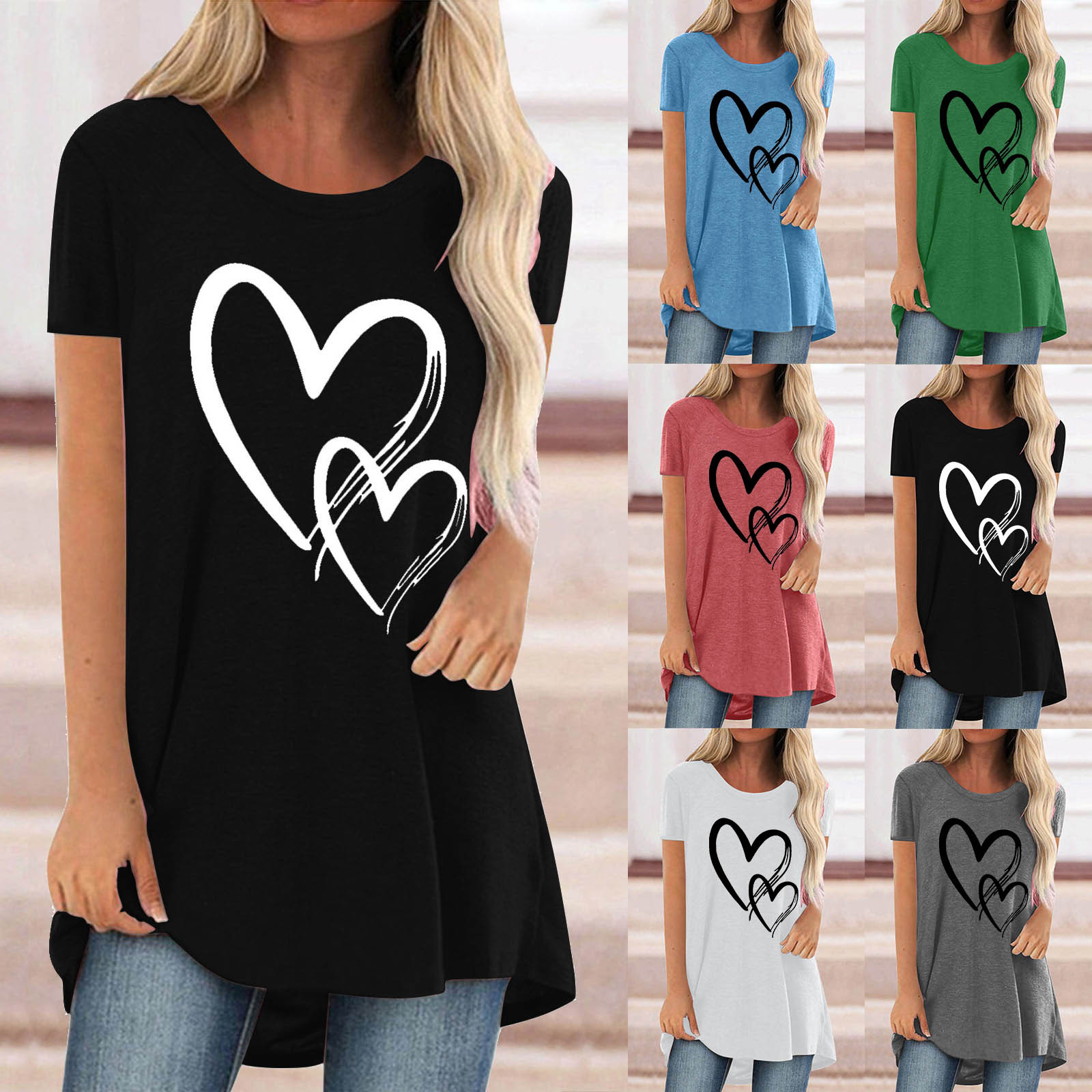 Amazon kaus lengan pendek leher bulat panjang plus kasual gambar cetak cinta tumpang tindih Hari Valentine baru 2022 untuk wanita