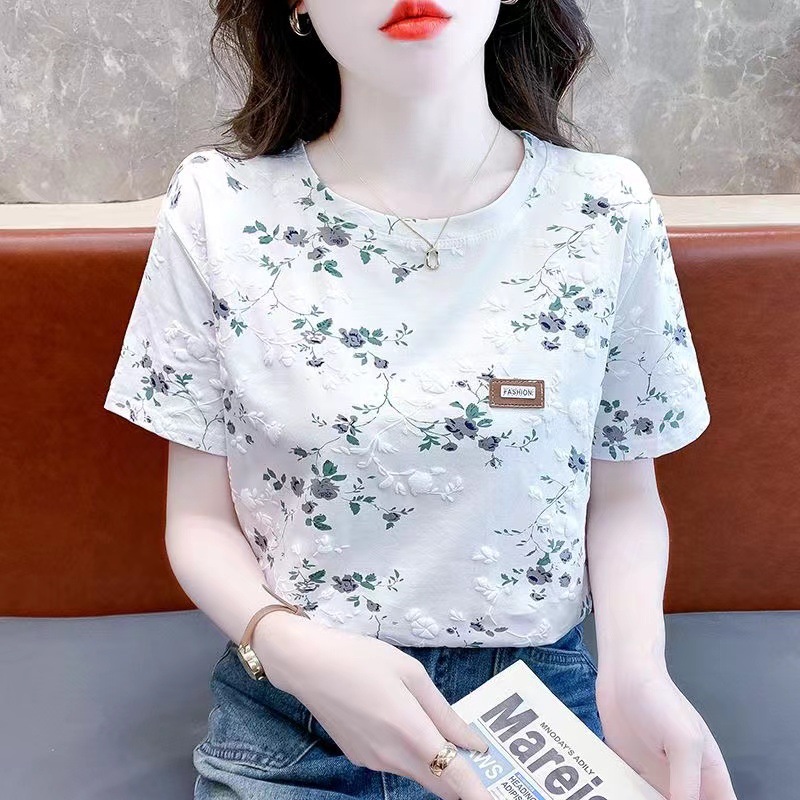 T-Shirt Lengan Pendek Pakaian Wanita Musim Panas Model Baru T-Shirt Lengan Setengah Warna Putih Motif Longgar Trendi Bunga Patah di Bahu Ins Pakaian Musim Panas Model Populer