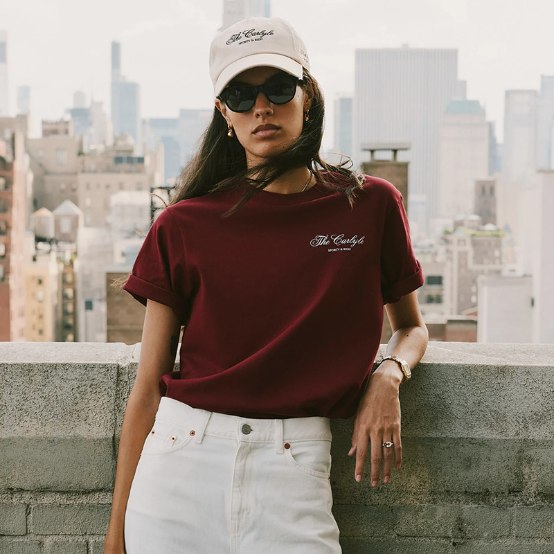 25 T-shirt Olahraga Lengan Pendek Wanita Kerah Bulat Katun Warna Merah Anggur Bermotif Huruf Niche S & R Model Baru Musim Panas Amerika Utara