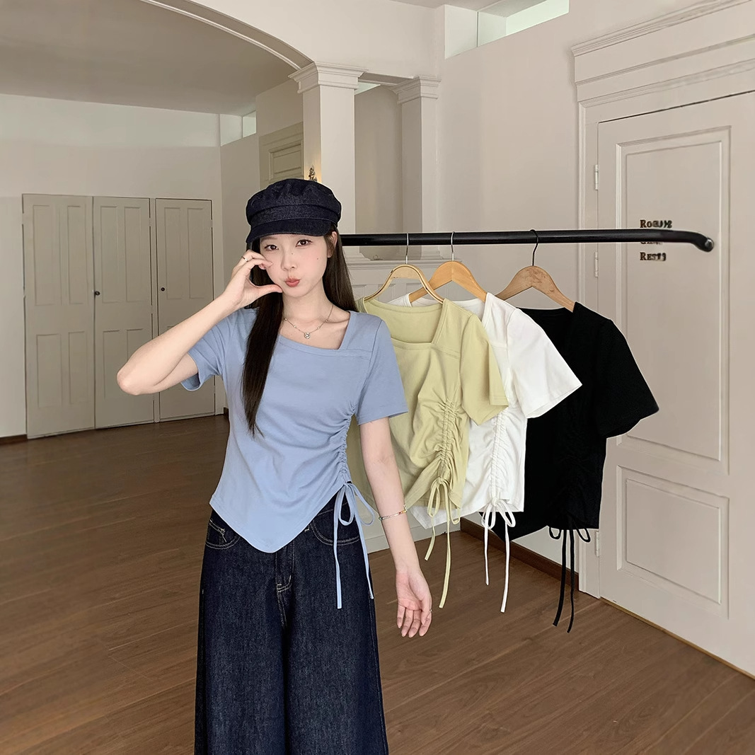 Kaus Lengan Pendek Niche Tali Serut Tidak Beraturan Desain Wanita Ukuran Besar Wanita Gemuk Model Baru Pakaian Musim Panas 2025