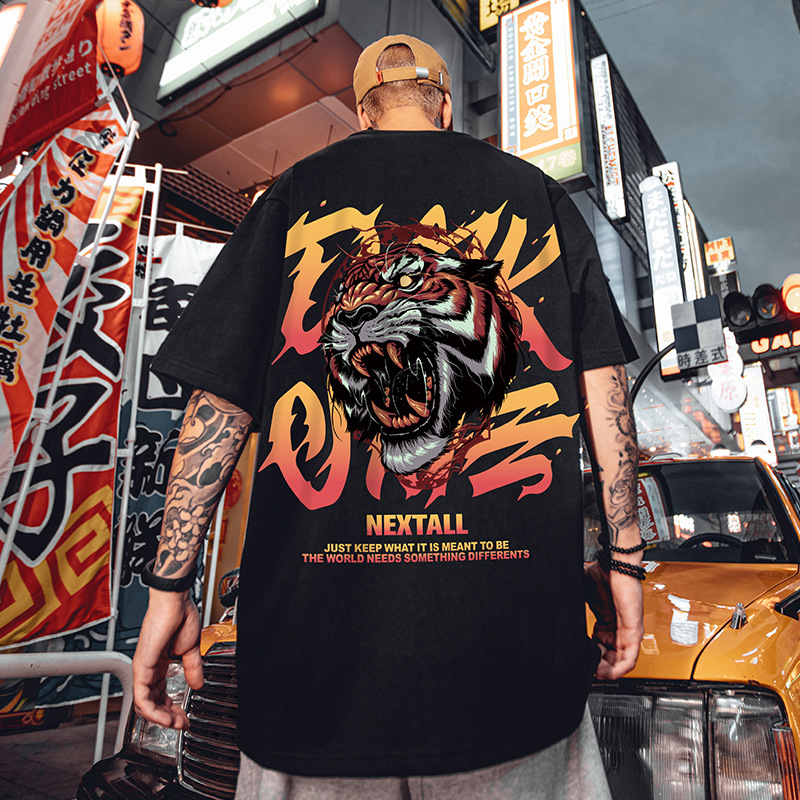 Kaus lengan pendek berat pria, Atasan katun cetak merek mode Amerika longgar ukuran besar musim panas 2023