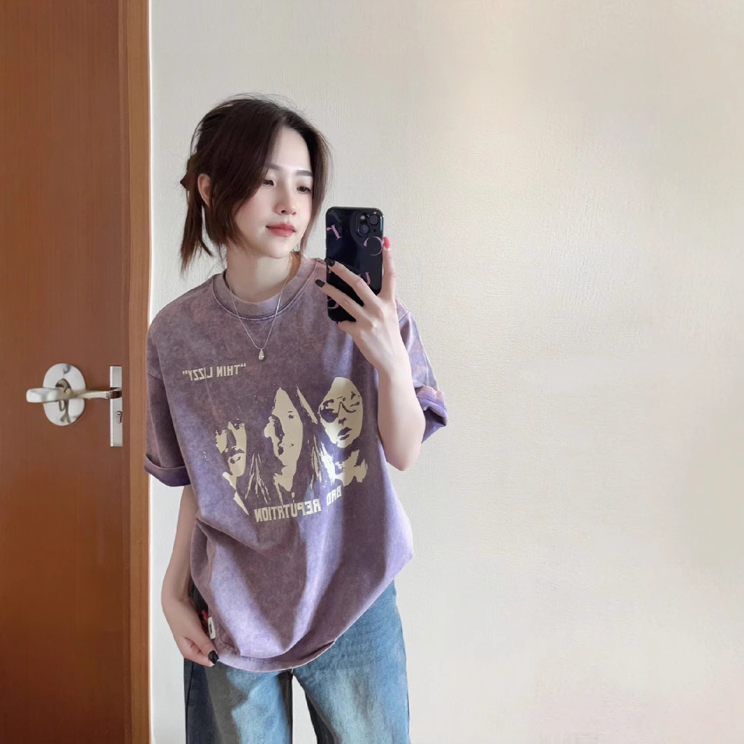 Kaus Lengan Pendek Dicuci dan Dicuci Air Talas Ungu Atasan Pasangan Pasangan Gaya Desain Longgar Ukuran Besar Retro Gaya Amerika Musim Panas Instagram