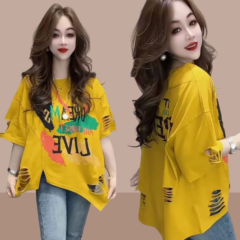 Pakaian Wanita Ukuran Besar Atasan Tidak Beraturan Berlubang Kecil Trendi Longgar Santai Menyenangkan Huruf Graffiti T-shirt Lengan Pendek Wanita
