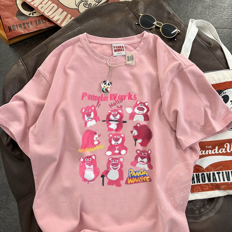 Kaus lengan pendek katun wanita Eropa 2024 musim semi dan musim panas baru longgar ukuran besar beruang stroberi atasan lengan setengah mengurangi usia