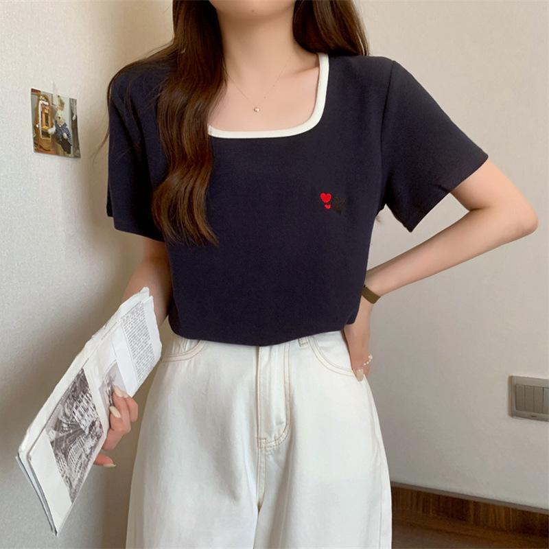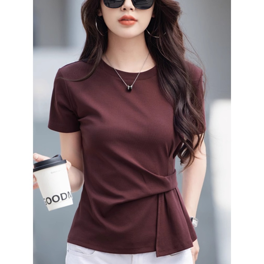 Kaus Lengan Pendek Gaya Barat Atasan Niche Desain Terlihat Langsing Lemak Menutupi Perut Tidak Teratur Musim Panas Katun Murni Wanita Atasan Niche A3938
