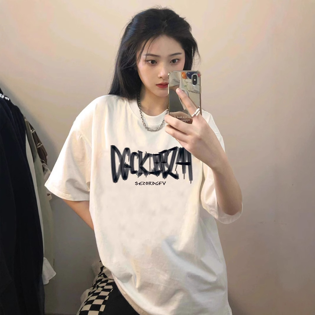 Kaus Lengan Pendek Motif Cetak Huruf Longgar Versi Korea Trendi Instagram Super Hot Musim Panas Model Baru 2025 Atasan Katun Murni Model Setengah Panjang Wanita