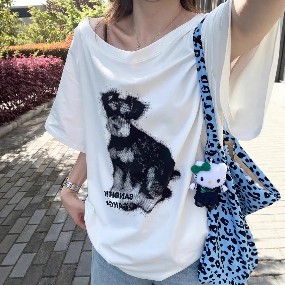 T-Shirt Wanita Lengan Pendek Bahu Miring Kerah Satu Huruf Atasan Bahu Terbuka Keren Manis Gaya Malas Longgar Model Baru Musim Panas 2025 Wanita Instagram