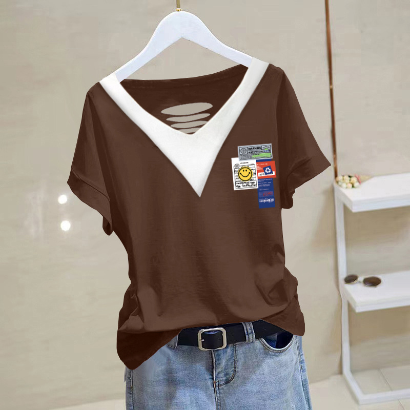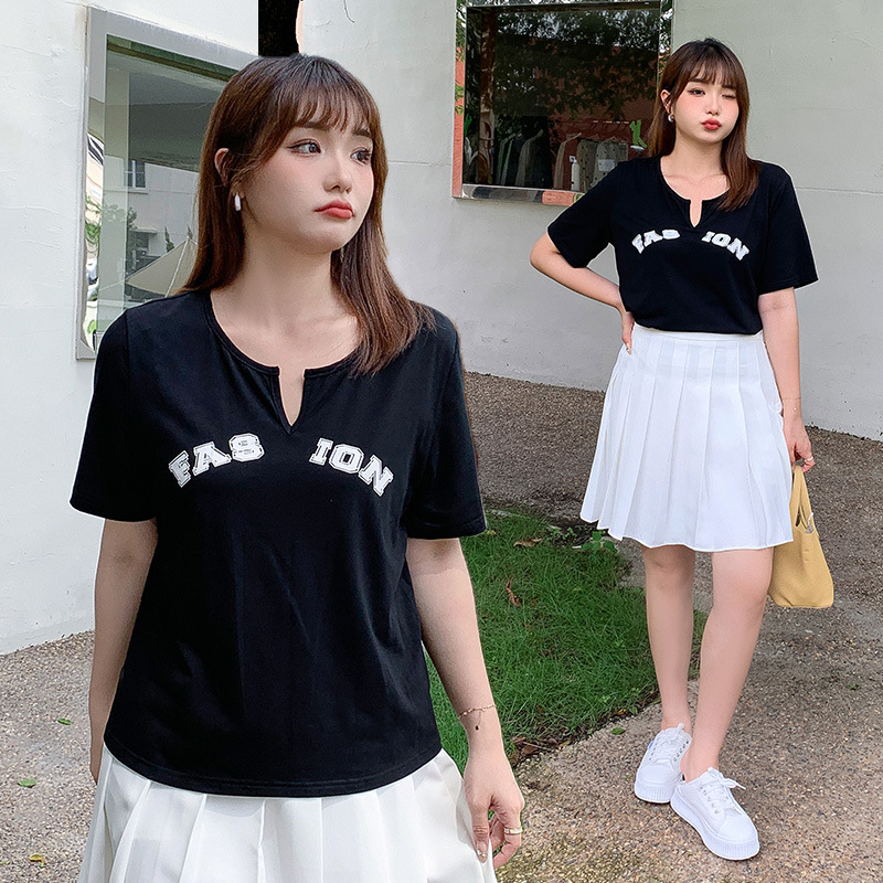 Kaus lengan setengah panjang wanita, atasan gaya Perancis ukuran besar, Kaus musim panas wanita sedikit gemuk, bahu Langsing, kaus lengan setengah, 3082
