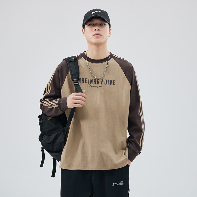 Kaus lengan panjang trendi untuk pria, kaos olahraga Raglan lengan panjang, T-shirt longgar ukuran plus musim semi dan musim gugur leher bulat, kemeja Dalaman trendi musim gugur
