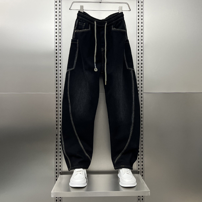 Celana Jeans Kerja Multi-Saku Versi Panjang Tinggi Versi Amerika Model Pria Kaki Lebar Longgar Merek Trendi Jalan Tinggi Berat Ukuran Besar