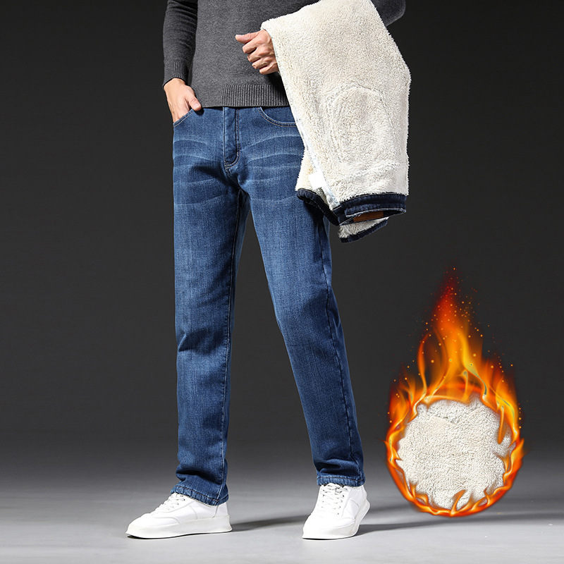 Jeans Pria Musim Gugur dan Musim Dingin Gaya Hong Kong Trendi Kaki Lebar Berlapis Bulu Domba Elastis Kasual Fashion Longgar Ukuran Besar Celana Panjang Lurus