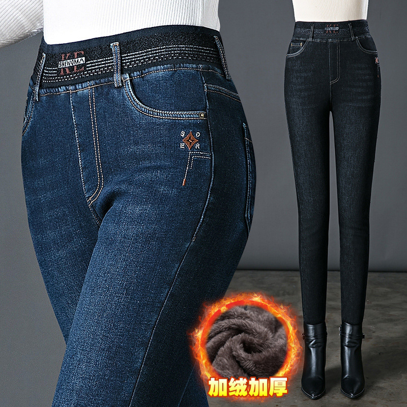 Celana ketat wanita jins tebal, celana jins musim dingin, celana ketat wanita, celana wanita jins tebal, celana jins ukuran plus, celana hangat ibu, usia paruh baya
