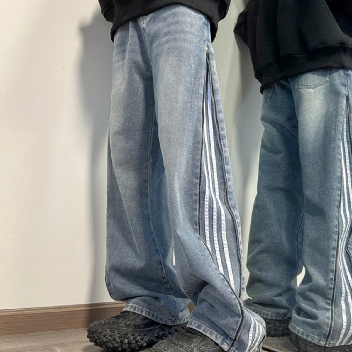 Celana hiphop pria gaya Eropa dan Amerika Pu bersih tampan tiga bar jin retro Amerika mengepel celana panjang kaki lebar lantai