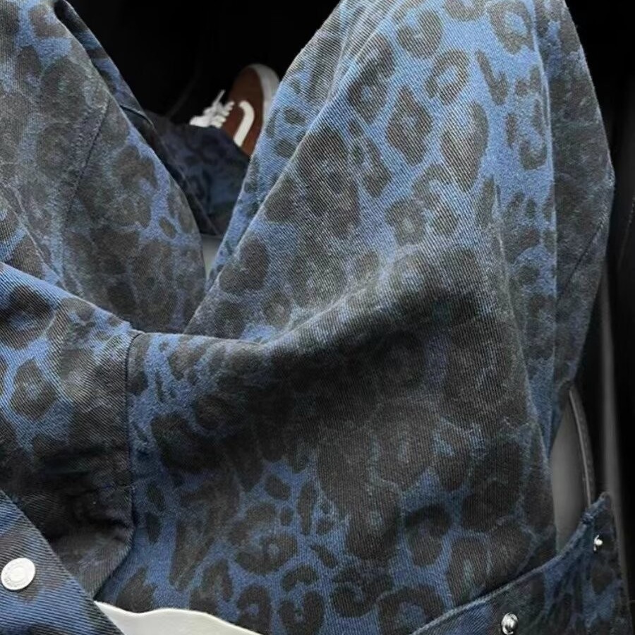 Celana Jeans Macan Tutul Biru Retro Gaya Amerika Celana vibe Jalanan Tinggi Gaya Eropa Amerika Celana Lebar Kaki Lurus Dicuci Air Desain Merek Trendi