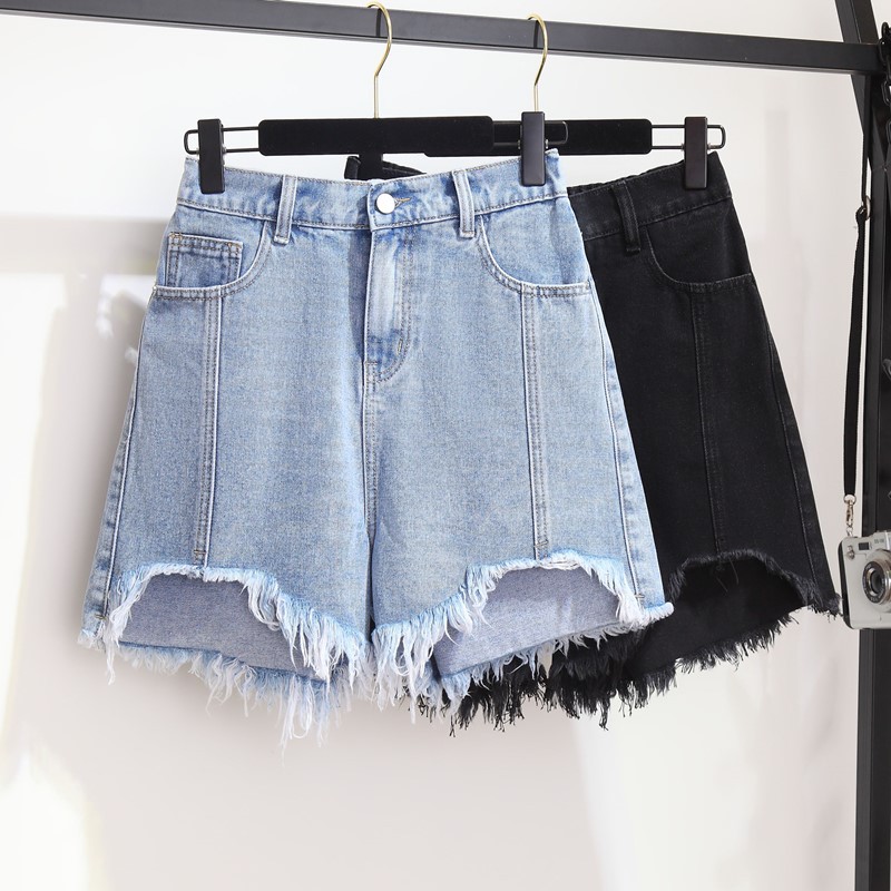 Celana pendek Denim, Chubby Girl ukuran plus, celana pendek Denim berjumbai, pakaian musim panas ekstra lemak, celana pendek kaki lebar sobek untuk wanita