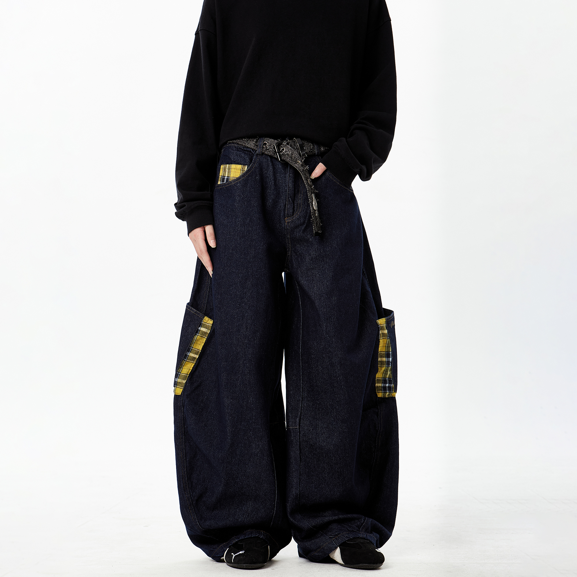 Celana Jeans Pinggang Kotak-kotak Kantong Besar Gaya Amerika Hiphop Celana Kaki Lebar Gaya Desain Pria Wanita Celana Albit Beggy