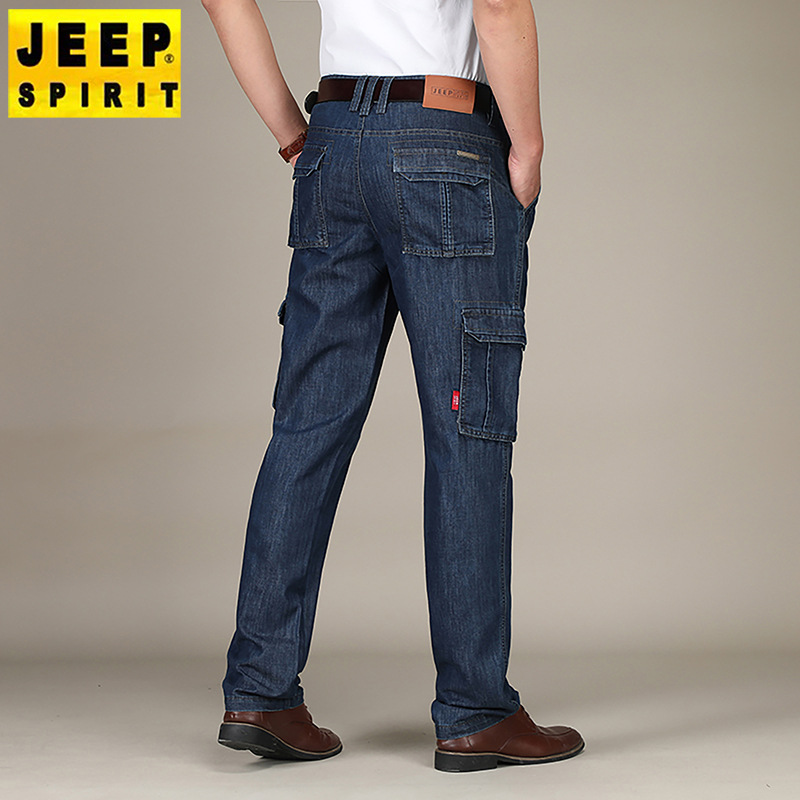 Celana jeans lurus longgar pria, pakaian kerja banyak saku luar ruangan celana panjang serbaguna empat musim musim musim semi dan panas