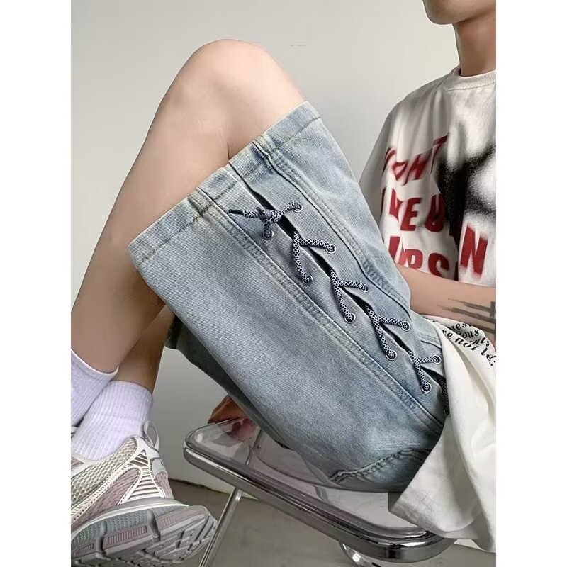 Celana Pendek Denim Tampan Merek Kekinian Gaya Amerika Celana Setengah Panjang Kasual Lurus Longgar Pria Model Tipis Musim Panas Pria