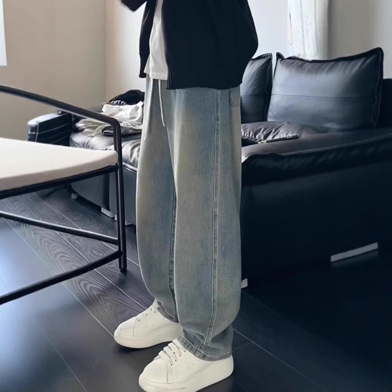Celana panjang jins pria, celana panjang pel kasual kaki lebar trendi lurus longgar pinggang elastis tali serut gaya Jepang 2024