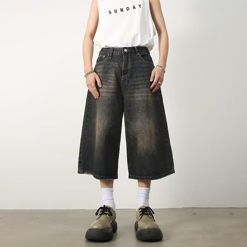 Celana Jeans 7 Poin Kaki Lebar Celana Pendek Denim Pria Gaya Amerika Lurus 7/8 Model Lama Dicuci Retro Berbentuk Siluet Longgar Musim Panas