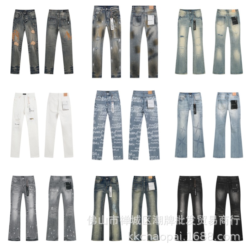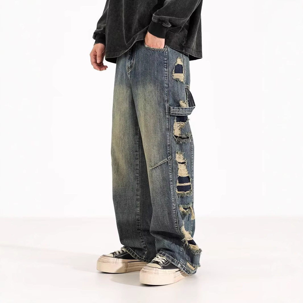 Celana Jeans Sambungan Rumbai Jalan Tinggi Amerika Celana Kaki Lebar Langsung Celana Jeans Pria Ukuran Besar Eropa Amerika Khusus Lintas Batas
