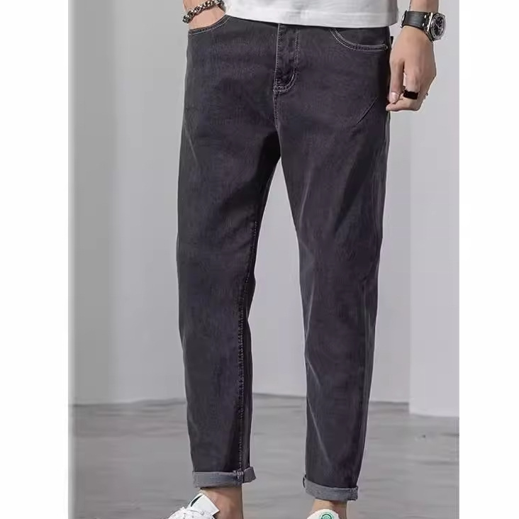 Jeans pria gaya Korea empat musim terbaru, celana panjang kasual modis, celana pria lurus longgar elastis yang nyaman dan trendi.