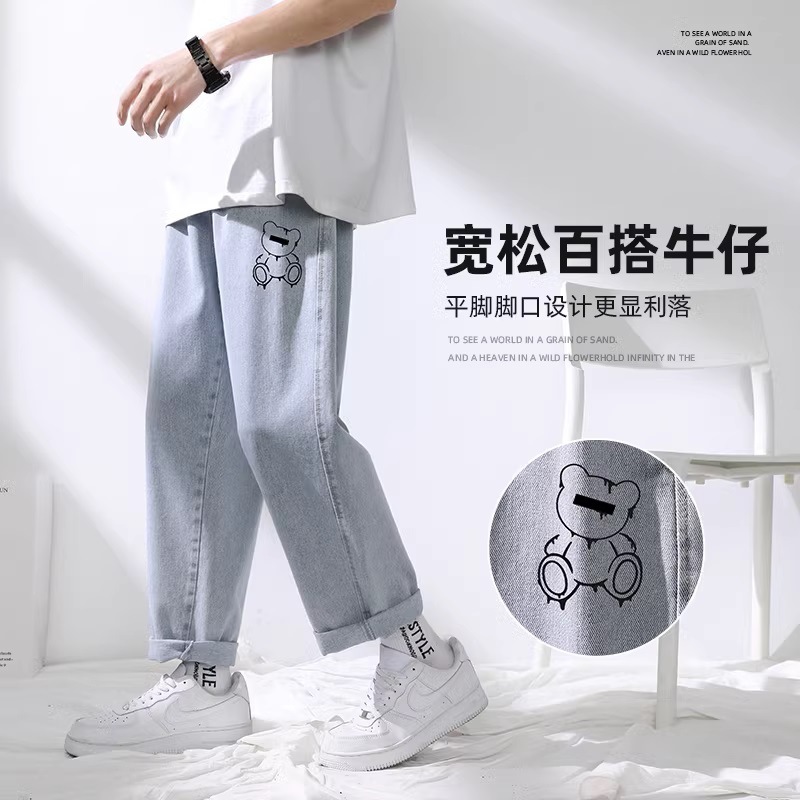 Jeans silang pria, jeans lebar longgar lurus untuk musim gugur dan musim dingin gaya Harajuku ins siswa tampan 2023