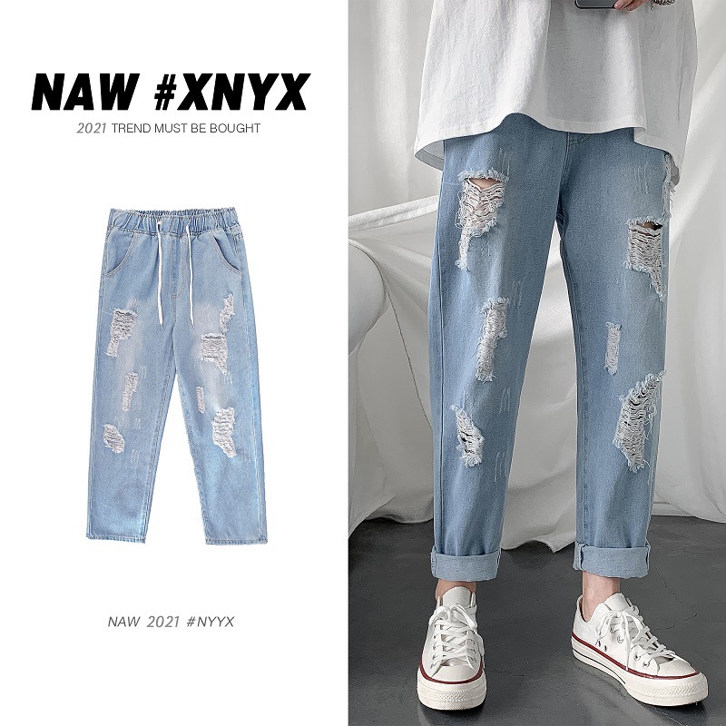 Hong Kong celana jins crop pria, celana jins potongan merek Mode gaya Korea, celana pinggang elastis musim panas untuk pelajar