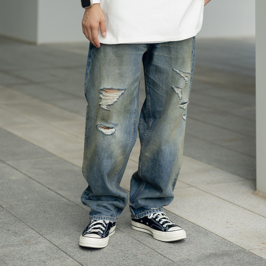 Celana Pengemis Berlubang Retro Tampan Kasual Gaya Amerika Musim Semi Celana Pengemis Pria Lurus Mudah Dipadu Padan Longgar