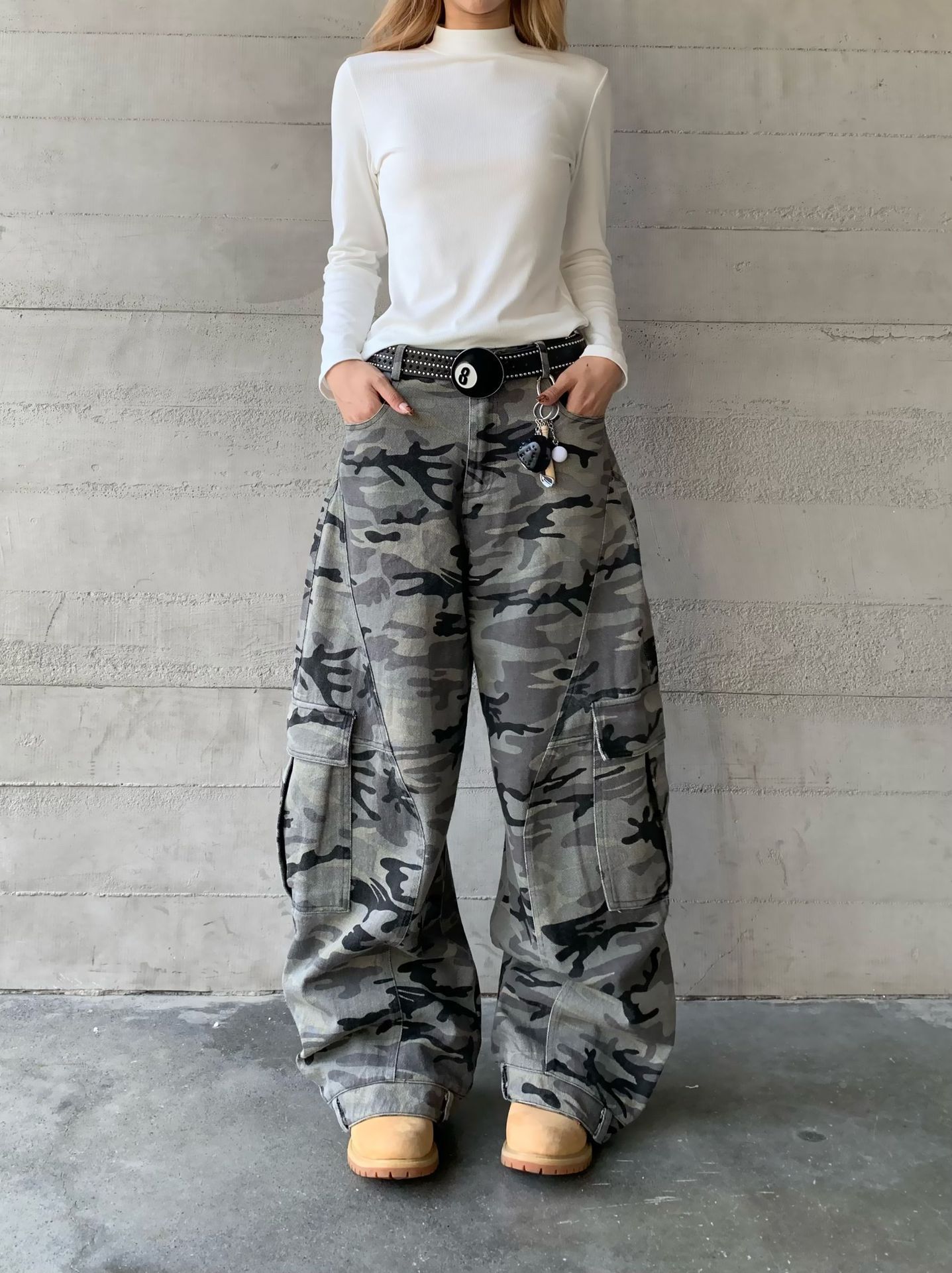 Celana Jeans Model Baru 2025 Model Amerika Kamuflase Pisau Kerja Celana Panjang Musim Gugur Longgar Berbentuk Siluet Celana Santai Kaki Lebar
