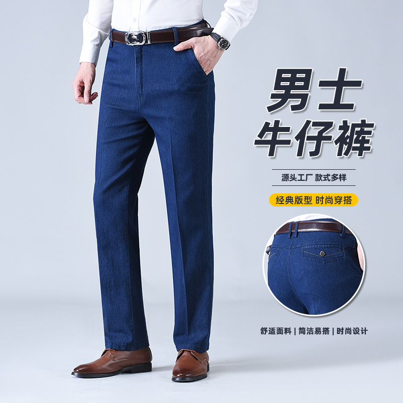 Celana Jeans Pria Musim Semi dan Musim Panas Longgar Pinggang Tinggi Lurus Longgar Celana Jeans Pinggang Terbuka Santai Elastis