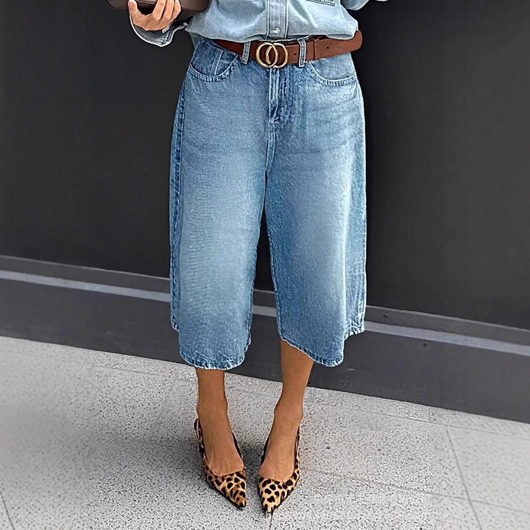 Celana Pendek Celana Pendek Lurus Denim Bahan Katun Bulat Warna Biru Pinggiran Elastis Pinggang Tinggi Ukuran Besar Wanita Model Baru Lintas Batas