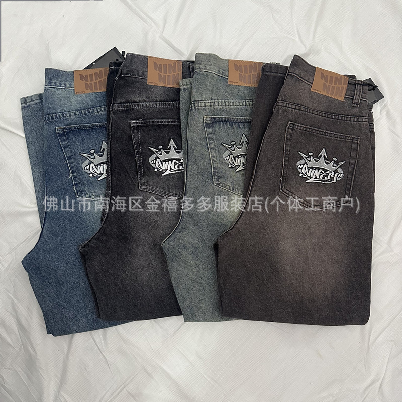 Celana panjang skateboard, celana panjang hip hop, celana grafiti longgar, lurus, bordir, Denim, mahkota vintage, jalan, longgar, gaya Jepang, 90s