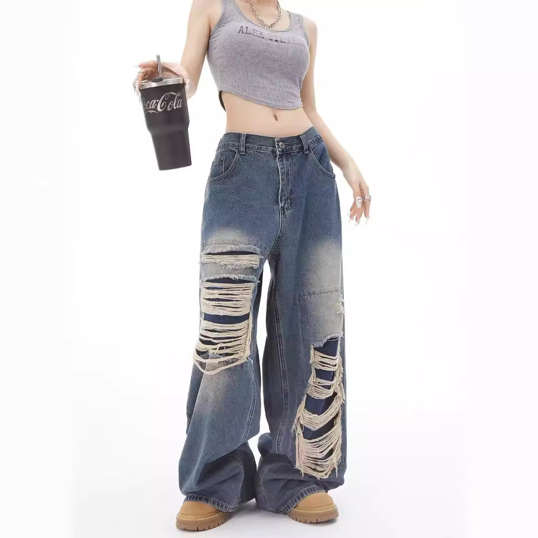 Celana Jeans Berlubang Retro Model Lama Musim Panas Wanita Celana Lebar Kaki Lurus Longgar Gaya Amerika