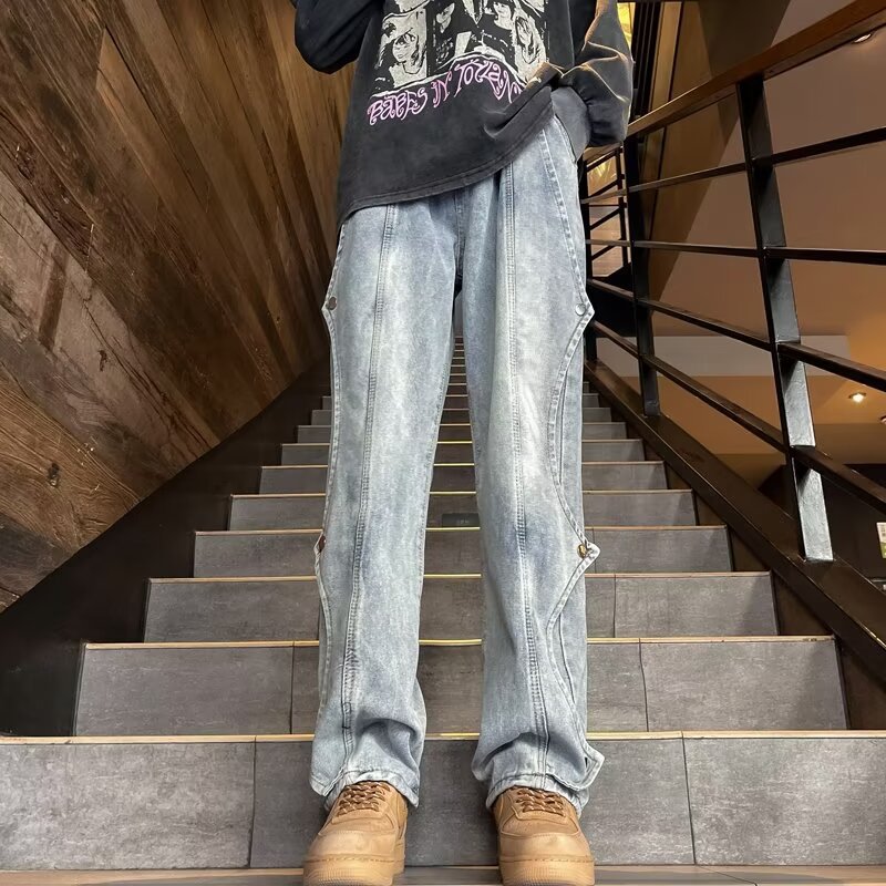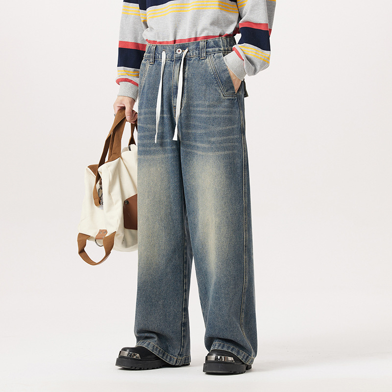 Celana panjang gaya jalanan, potongan lurus dicuci vintage jeans celana panjang pria longgar nostalgia mengepel celana kaki lebar