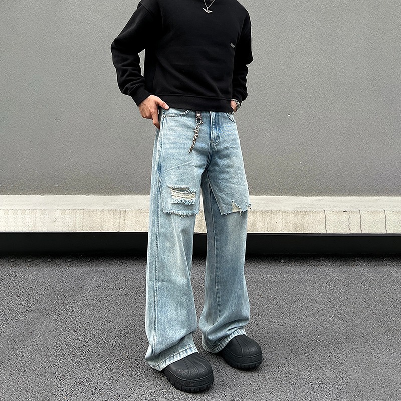 Muqiu Pakaian Pria Celana Jeans Lumpur Kuning Dicuci Air Model Baru Musim Gugur dan Musim Dingin Celana Kaki Lebar Ukuran Besar Gaya Amerika Merek Trendi Kelas Atas Pria