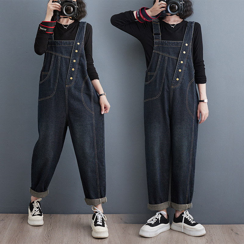 Celana crop ramping longgar wanita, bawahan Denim suspender ukuran besar, sederhana dan musim gugur gaya Jepang untuk perempuan