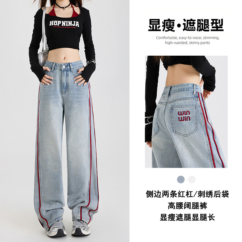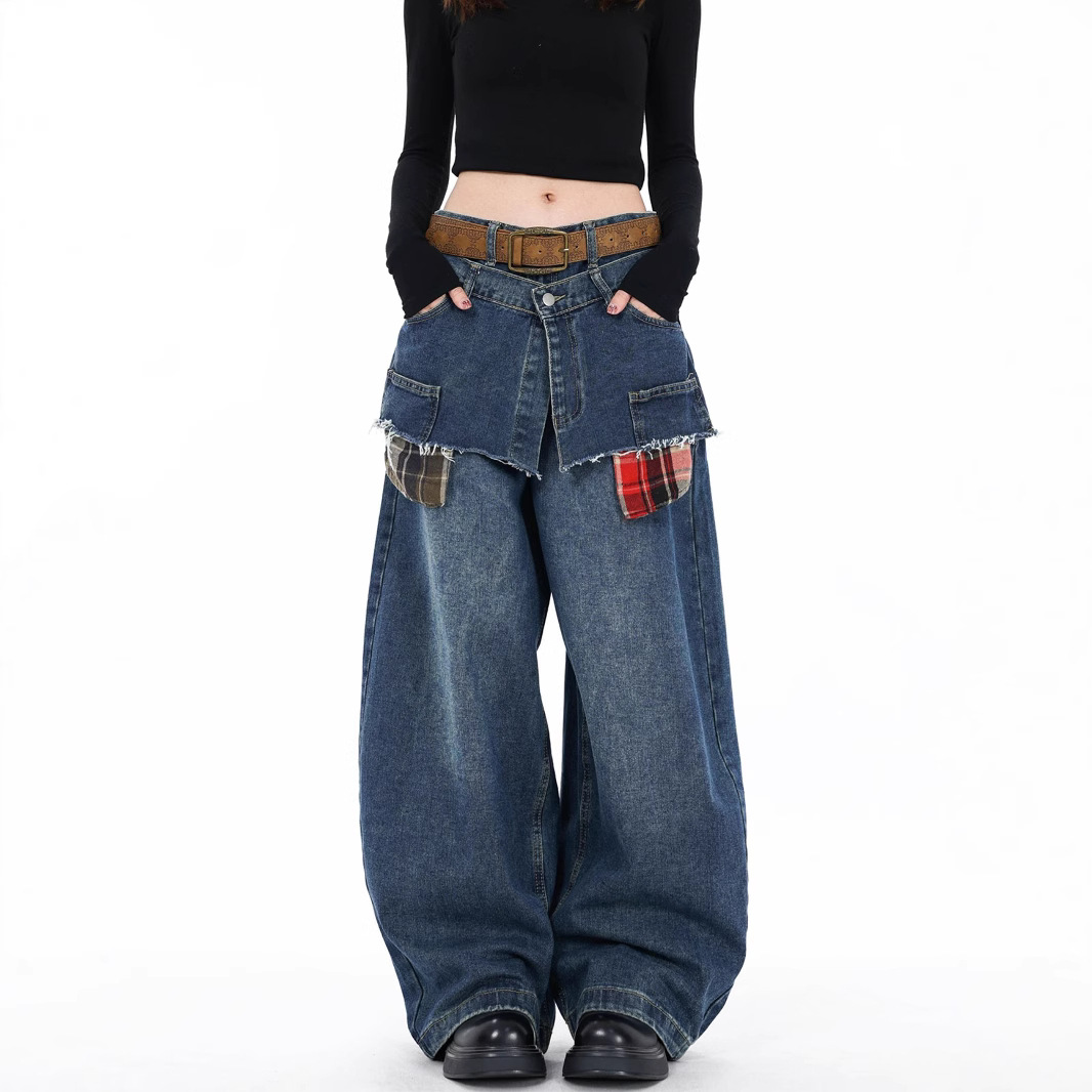 Celana Wanita Kaki Lebar Denim Ukuran Besar Model Baru Lintas Batas Celana Kasual Saku Longgar Lurus Kucing Lurus Terlihat Langsing Berpinggang Tinggi