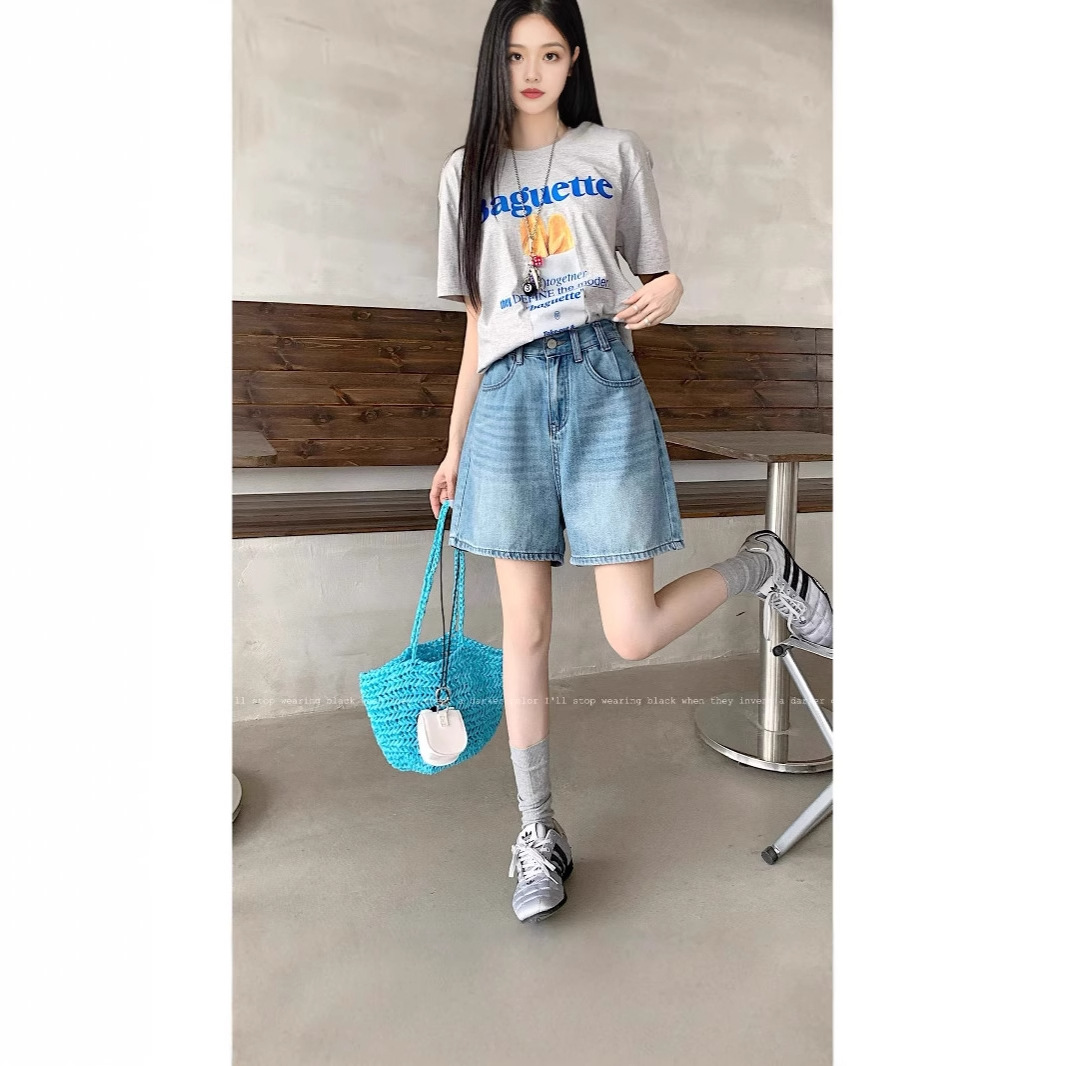 Celana Pendek Denim Pinggang Elastis Retro Ukuran Besar Model Baru Celana Panas Kaki Lebar Huruf A Terlihat Ramping Mudah Dipadu Padan Sederhana Kasual Musim Panas