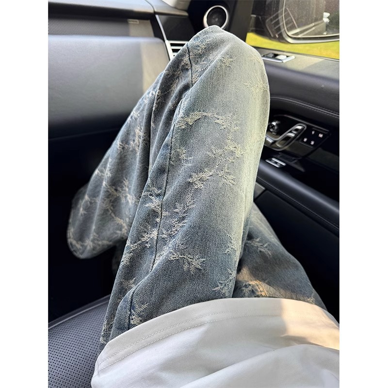 Celana Jeans Jacquard Pria Bermerek Populer Instagram High Street Celana Panjang Lurus Longgar