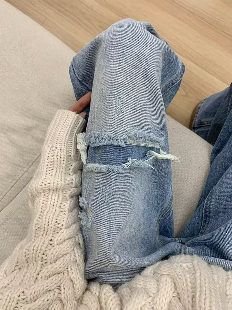 Celana Jeans Berlubang Gaya Hong Kong Celana Panjang Kaki Lebar Pengemis Eropa Model Sama dengan Pria dan Wanita