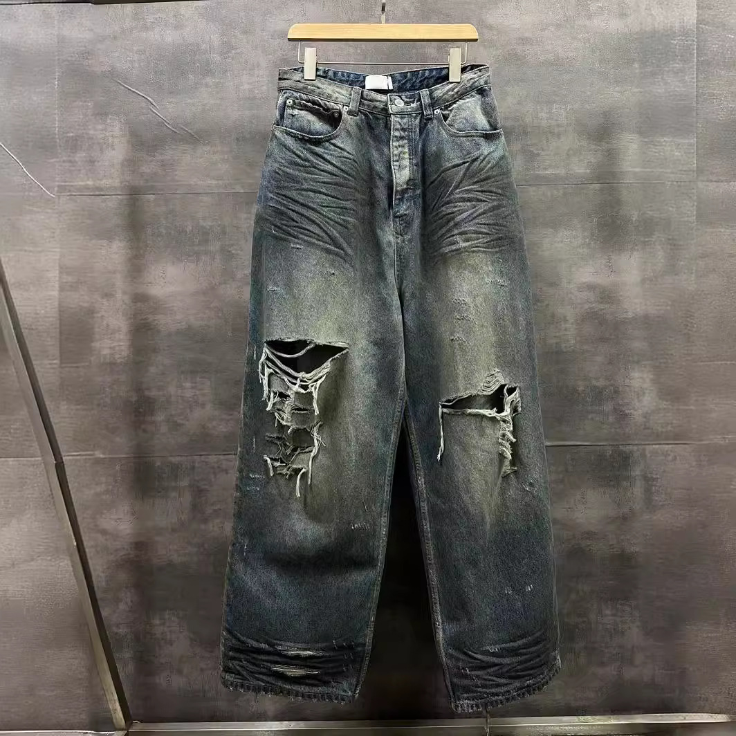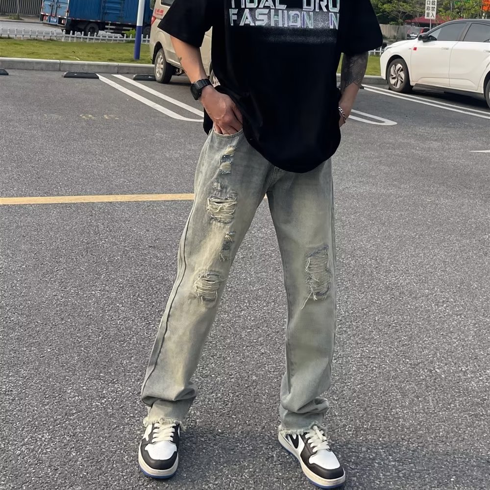Celana Jeans Lurus Merek Trendi Gaya Hong Kong Celana Kaki Lebar Longgar Model Baru Musim Semi Celana Panjang Pel Tanah Kasual Kotak Tidak Beraturan