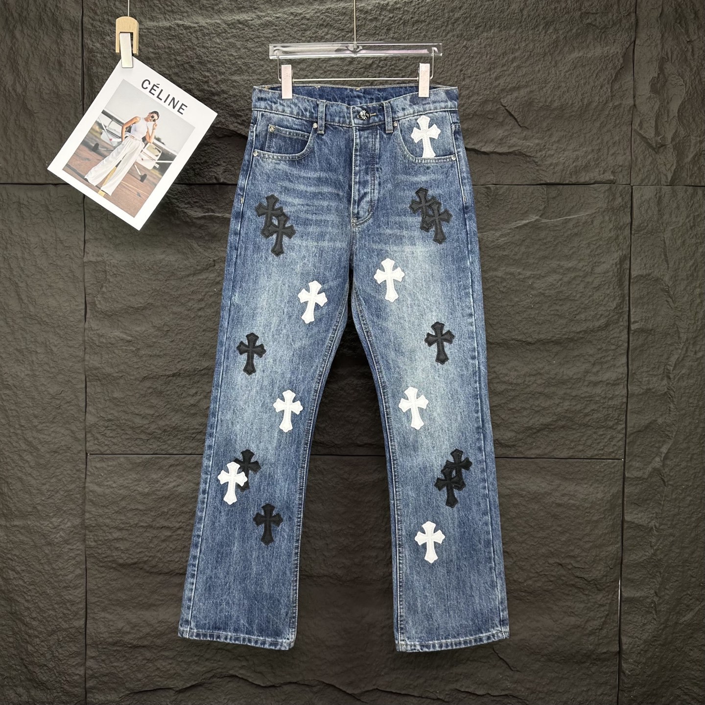 CH Cro Celana Jeans Kecil Dicuci Air Longgar Pasangan Pasangan Bordir Kulit Silang Hitam Putih Model Baru Empat Musim 2025