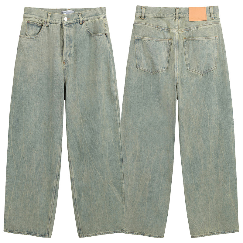 Celana Panjang Denim Kasual Musim Semi Musim Panas Pinggiran Kaki Lebar Longgar Kuning Pudar Retro Cuci Air Retro Nostalgia AC Merek Trendi Model Baru