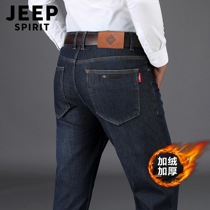 Celana panjang Denim pria, bawahan berlapis bulu tebal, regang pinggang Sedang ukuran besar longgar lurus warna polos musim dingin