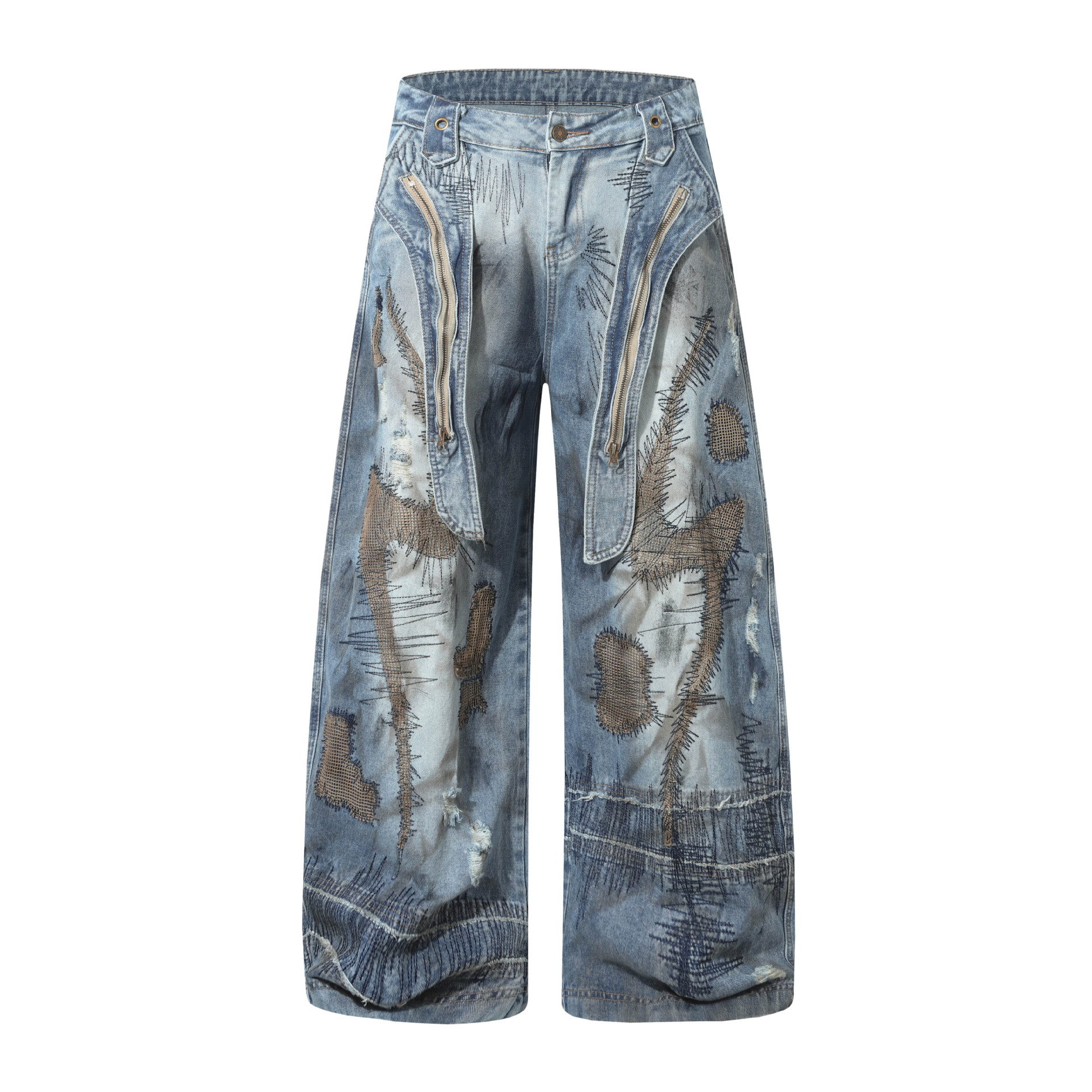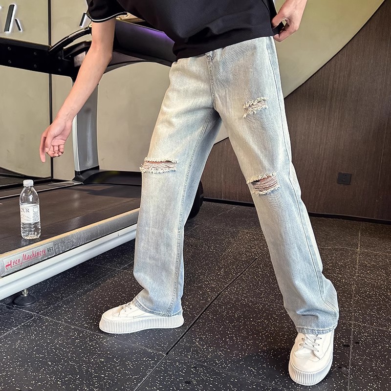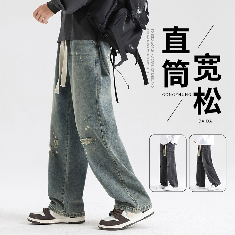 Jins jalanan tinggi Amerika musim semi dan musim gugur celana lurus pria merek mode retro longgar mode robek celana kasual kaki lebar