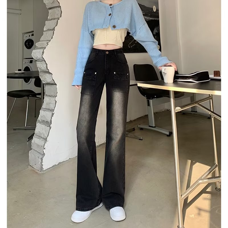 Celana Kerja Denim Kasual Gaya Amerika Banyak Saku Celana Kaki Lebar Mudah Dipadu Padan Terlihat Kurus Longgar Pinggang Tinggi Retro Model Baru Musim Gugur Wanita